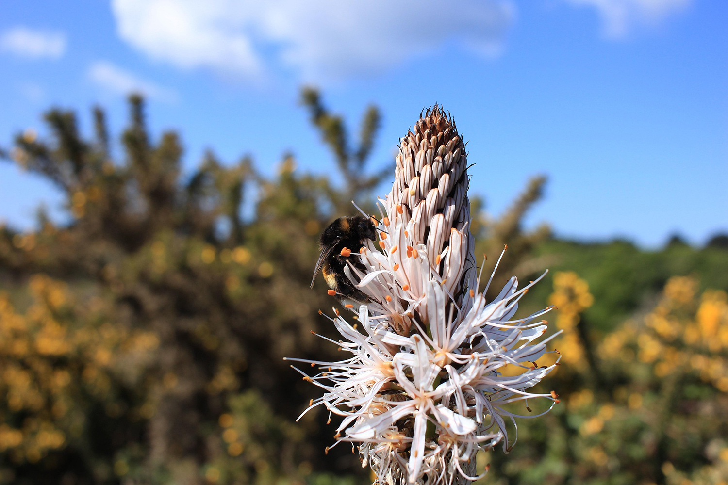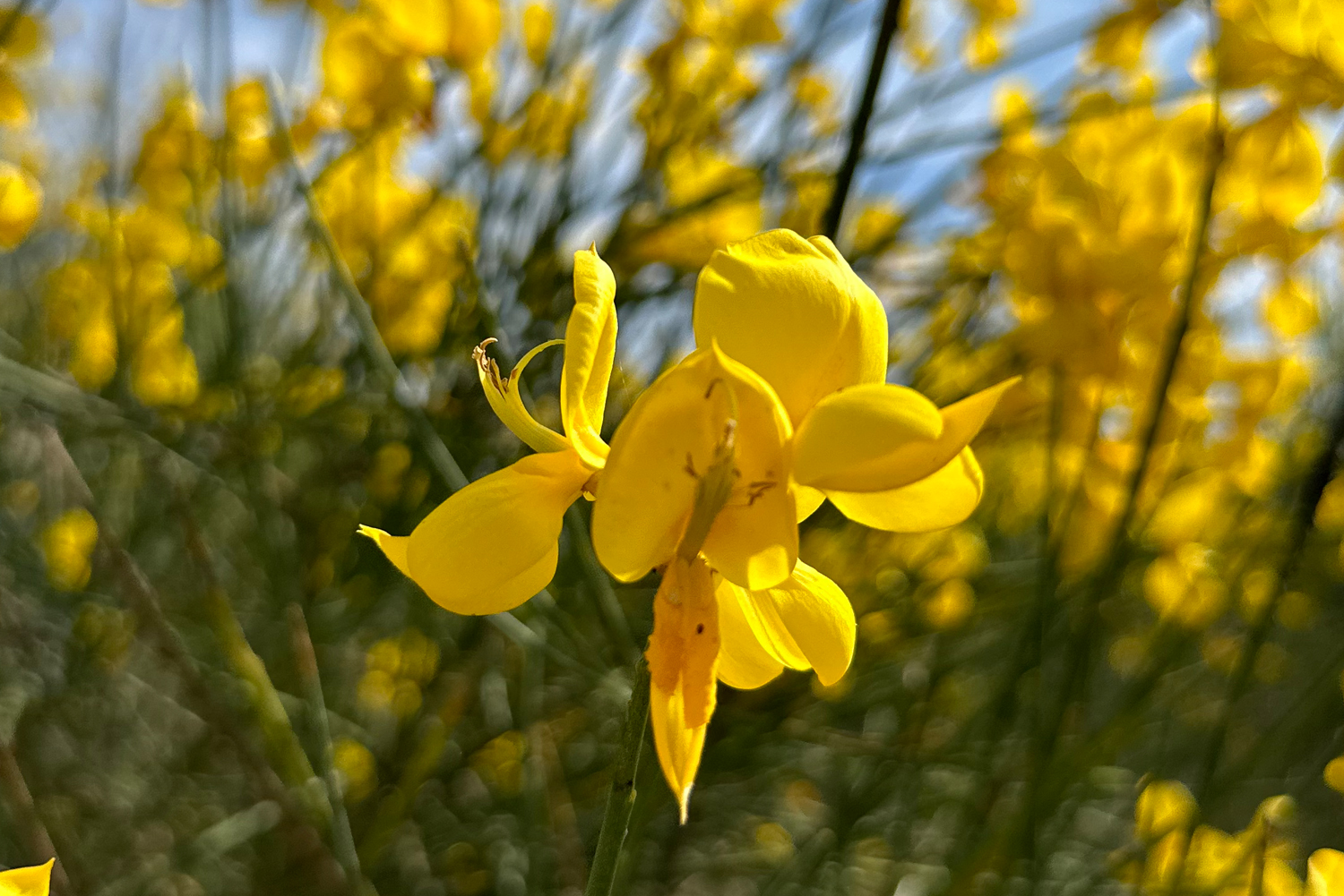 Gleichzeitig beginnt der Ginster zu blühen. Seine enorm leuchtend gelben Blüten setzen kräftige Farbakzente in der Landschaft. Ganze Hänge können plötzlich gelb aufleuchten und an vielen Straßen glaubt man dann, durch gelbe Tunnel zu fahren. Wenn ihr durch solche Gebiete wandert, liegt ein feiner Honigduft in der Luft.