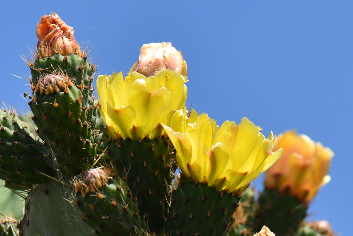 Jetzt blühen Rosmarin, mediterrane Kräuter und die ersten Kaktusfeigen. Die Opuntien tragen große gelbe oder orangefarbene Blüten, aus denen später die bekannten Kaktusfeigenfrüchte entstehen.