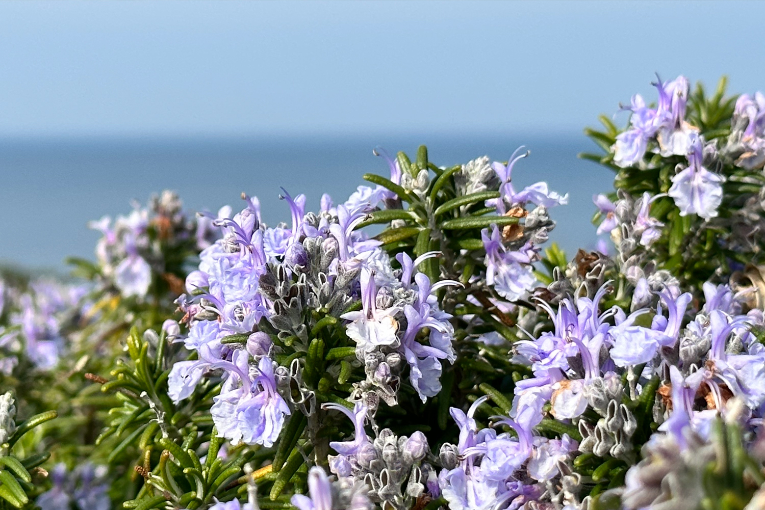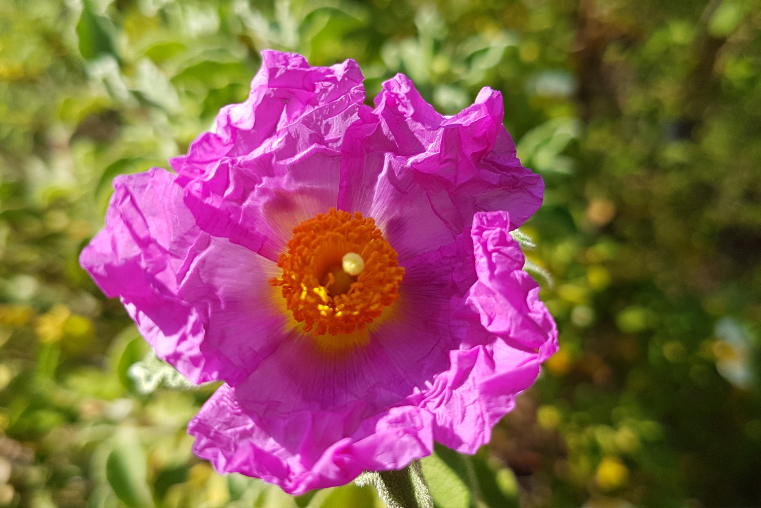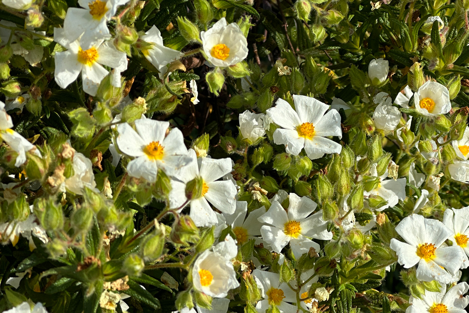 Besonders typisch sind jetzt die Zistrosen (eine Aromapflanze). Ihre zarten weißen oder lila-rosafarbenen Blüten erinnern ein wenig an Wildrosen und wachsen in großen Mengen in der mediterranen Macchia. Wenn die Sonne scheint, öffnen sich ihre Blüten weit – und schließen sich am Abend wieder.